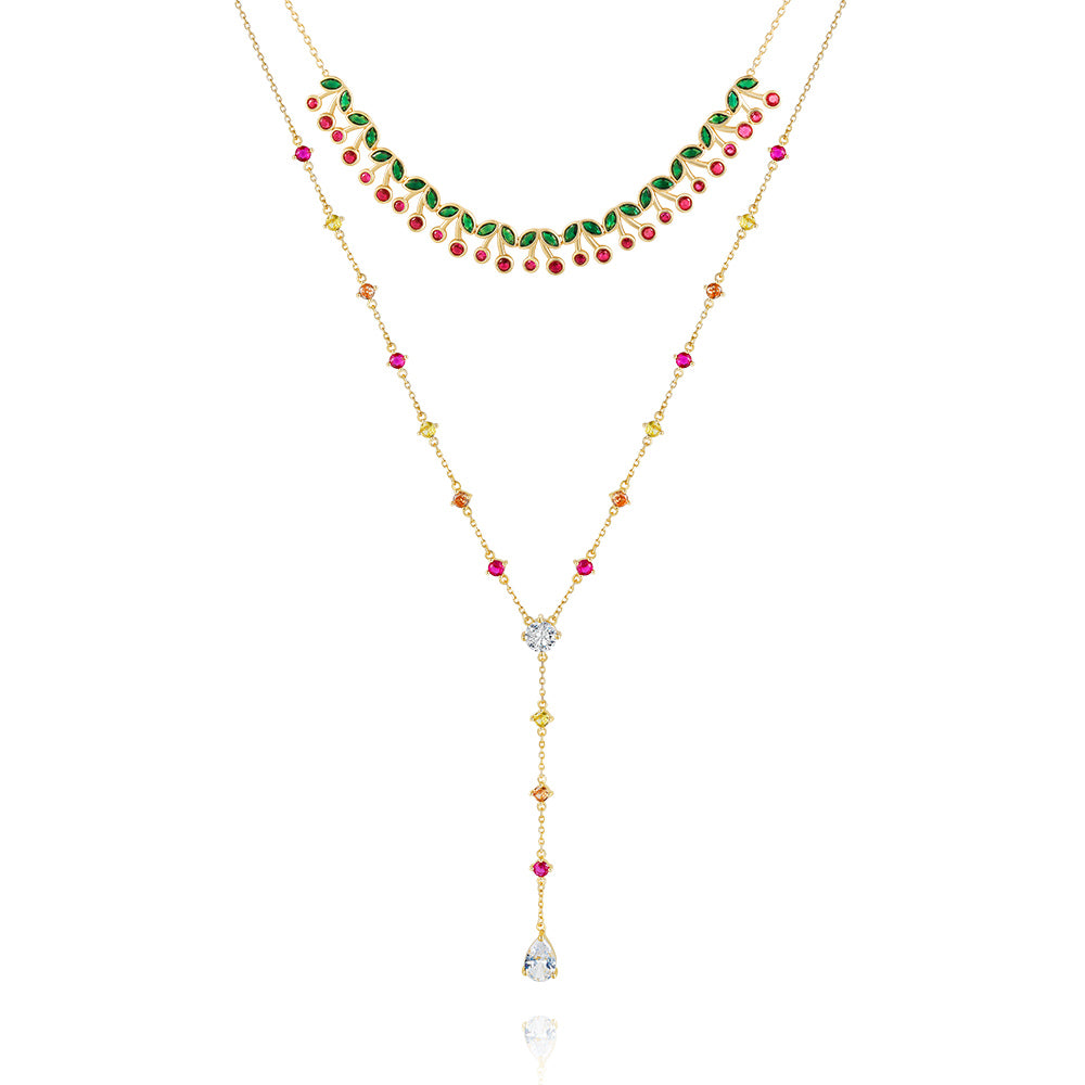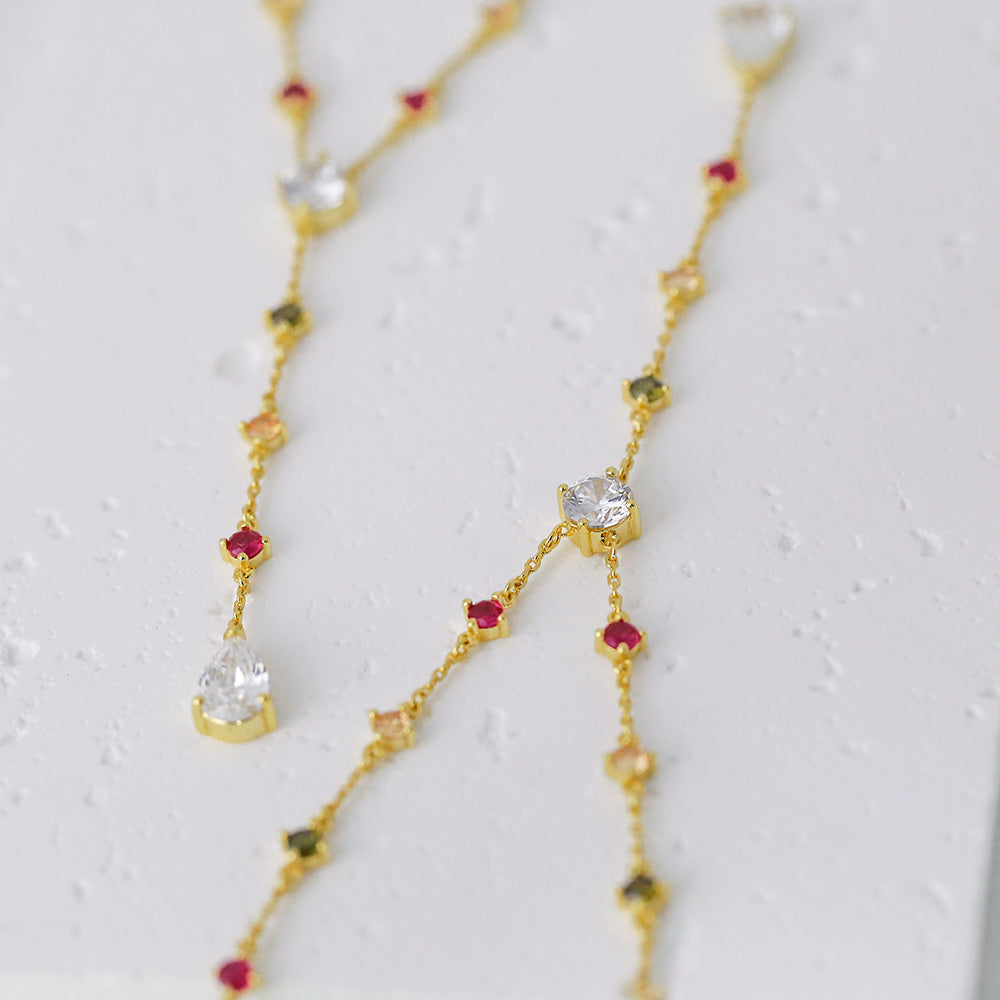 This necklace is delicately designed with multiple vivid gemstones. Finished with a sparkling crystal pendant as the finishing touch, it's the epitome of playful elegance, perfect for any occasion.