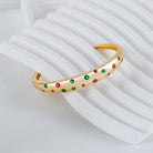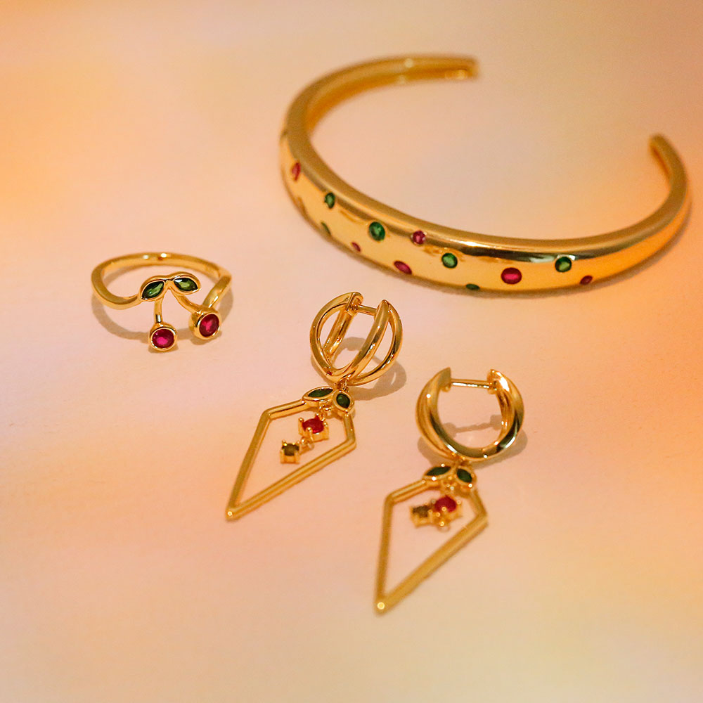 Scattered gemstones in luscious ruby-red and sparkling emerald-green hues bring a burst of vibrancy, while the sleek gold-tone finish exudes a polished and luxurious look. Its minimalist yet bold design makes it ideal for elevating both casual and formal outfits with ease.